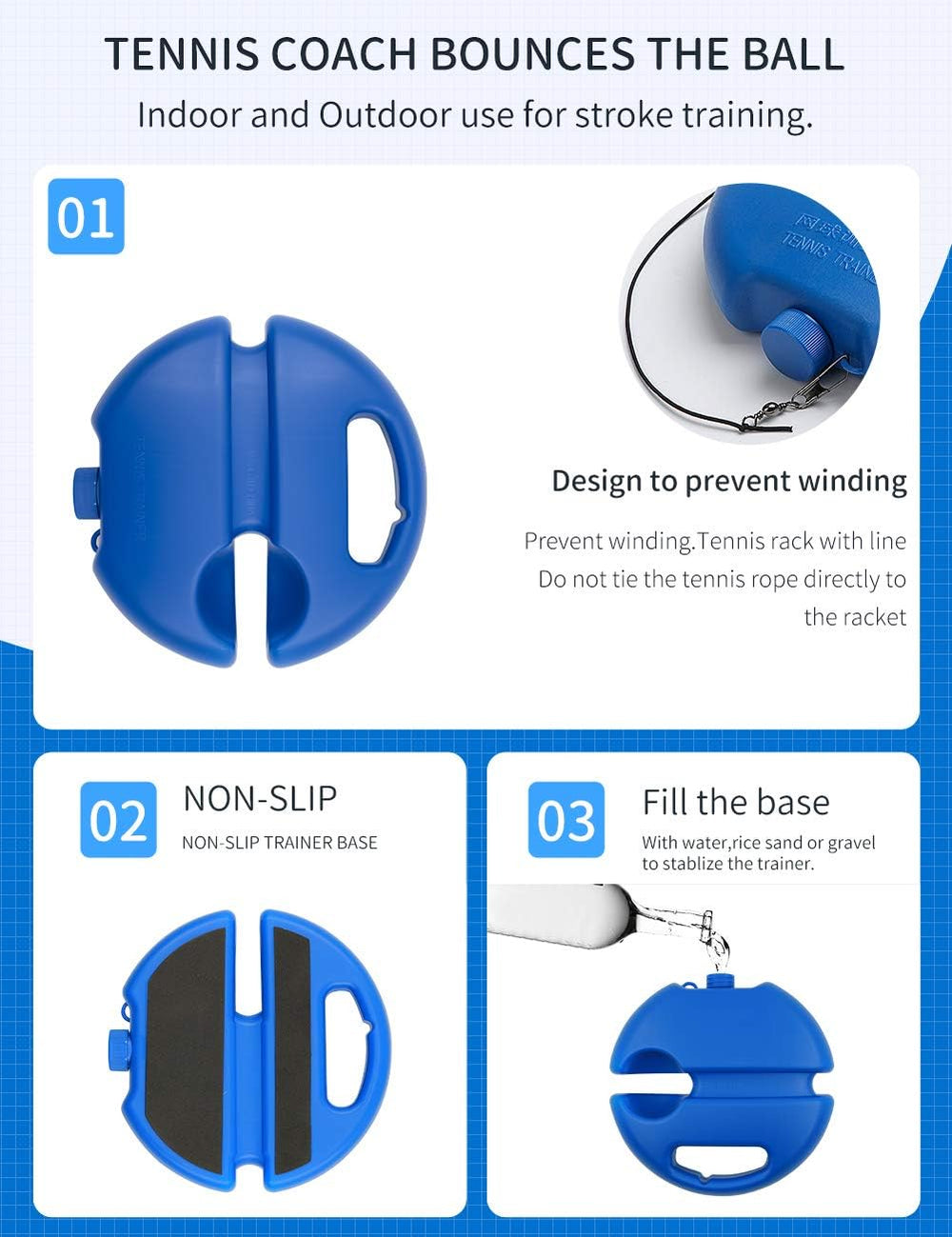 THE SOLO TENNIS TRAINER BASE HAS A VALVE, WHICH CAN BE FILLED WITH WATER OR SAND TO INCREASE THE WEIGHT WHEN USED, MAKING THE BASE MORE STABLE.